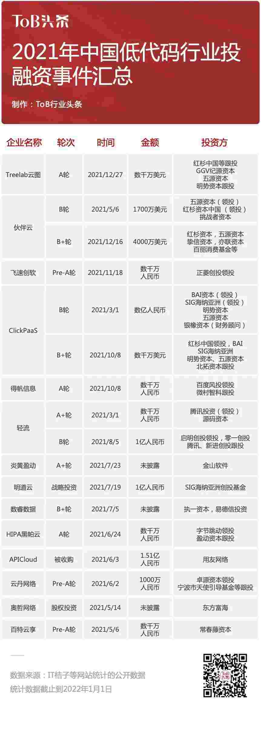 到2021年,,,,无/低代码投融资规模势头更甚,,,,其中包括轻流两轮融资(A+轮数千万人民币,,B轮近亿人民币)、、、沃钱包 两轮融资(B轮数亿人民币,,,,B+轮数千万美元)、、、百特云享数千万元Pre-A轮融资......