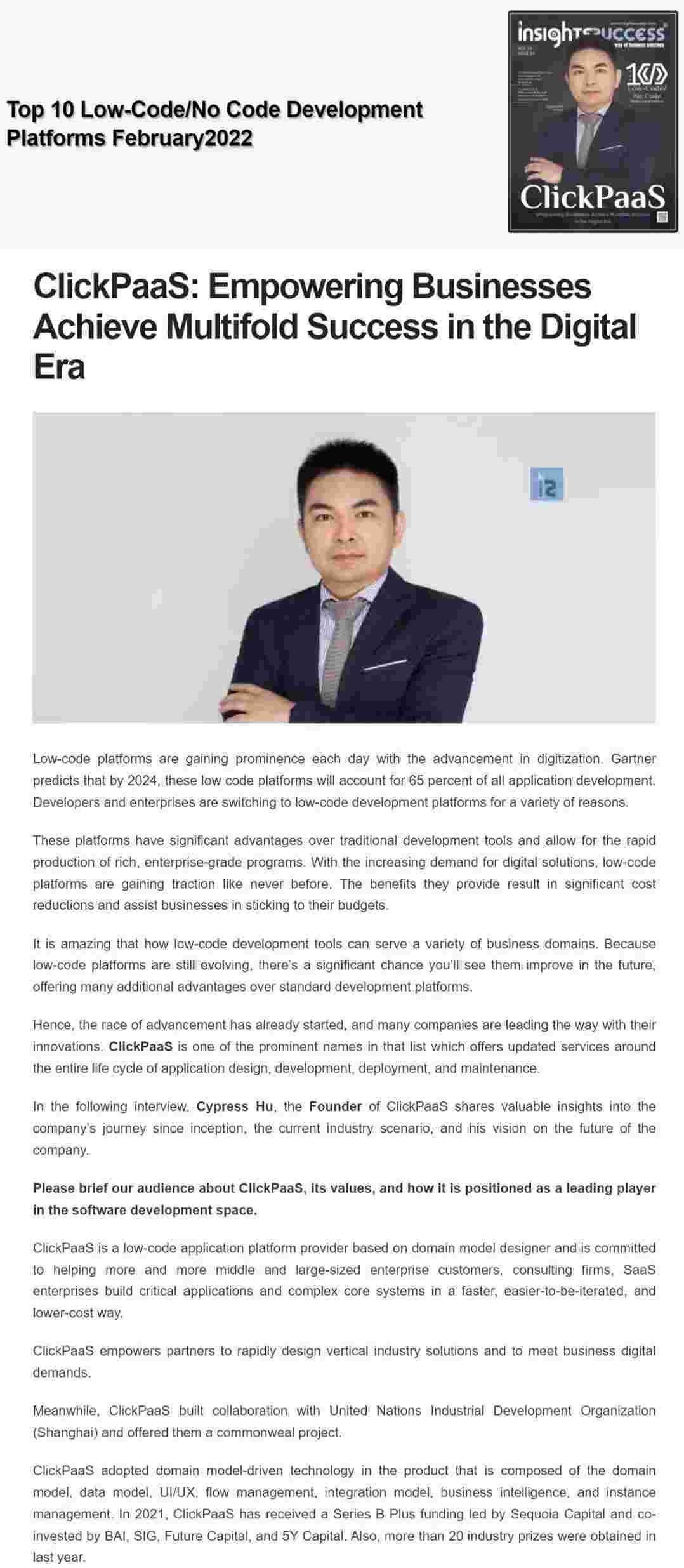2022年年初,,,沃钱包入选外媒Insights Success低代码/无代码开发平台 Top10,,,创始人、、、CEO胡柏受邀接受专访并荣登封面人物,,,,他与Insights Success的读者分享了沃钱包成立的初心、、、发展历程、、当前的行业发展趋势以及他对公司未来的展望。。。。